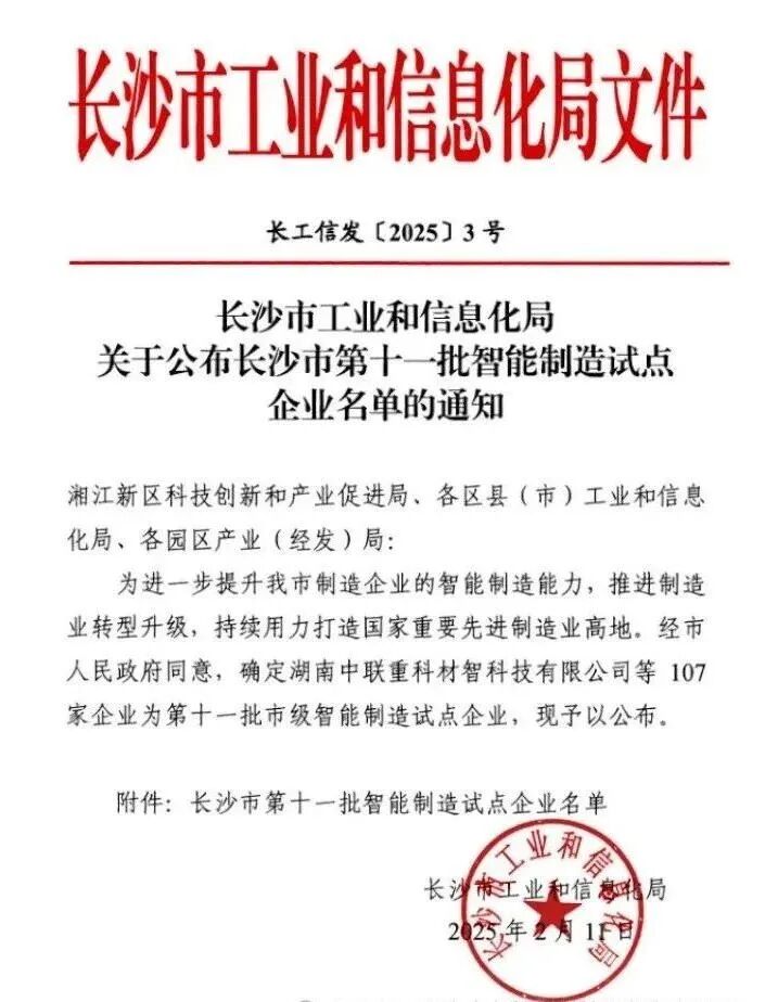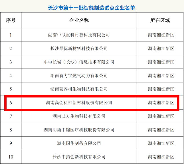 近日,长沙市工业和信息化局公布长沙市第十一批智能制造试点企业名单,湖南高创科惟新材料股份有限公司成功入选。